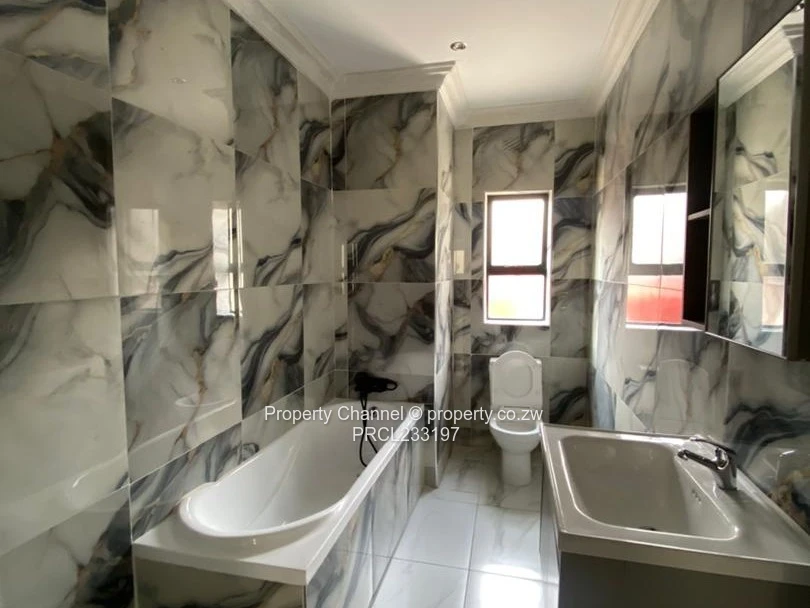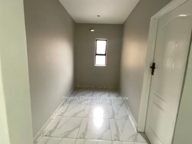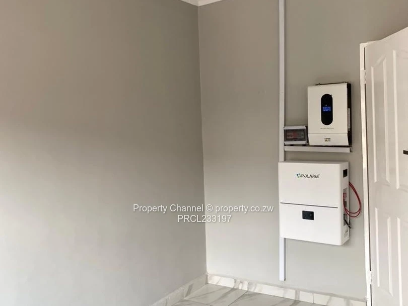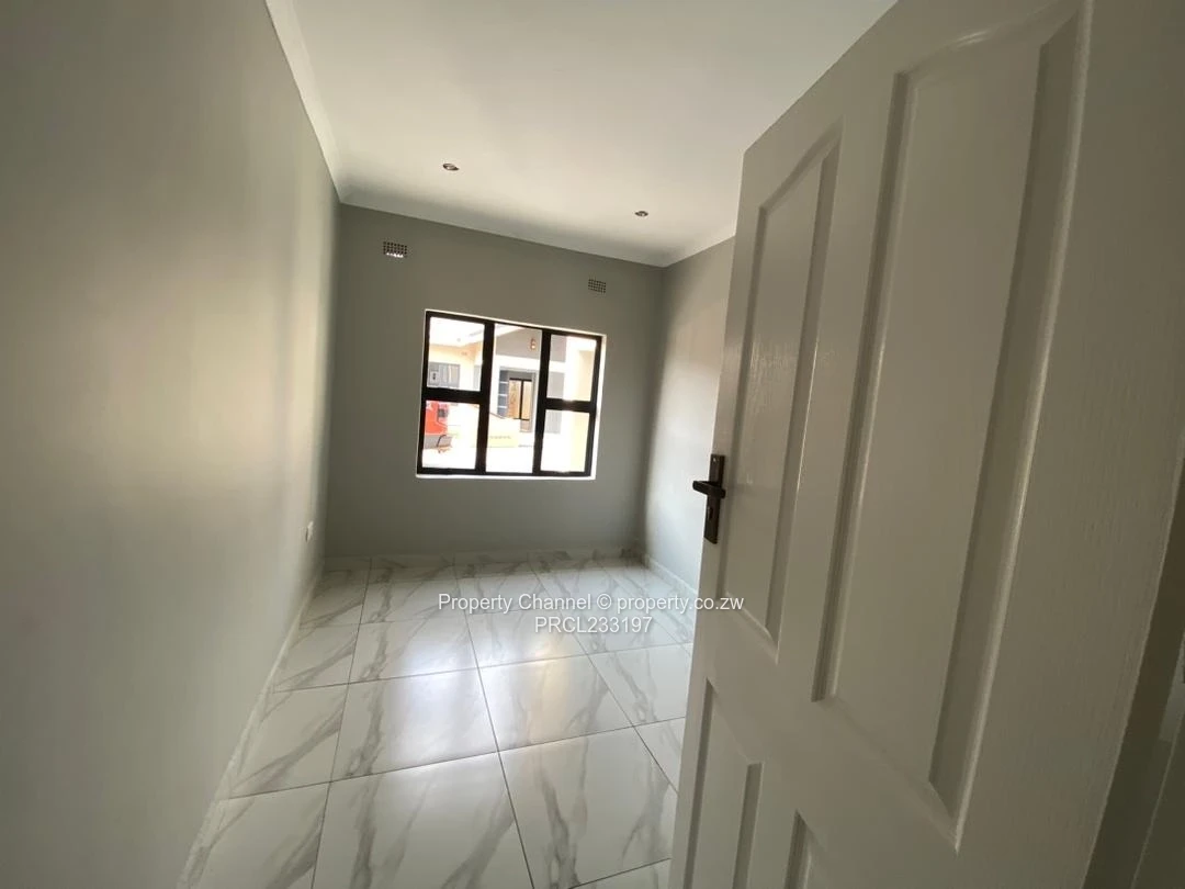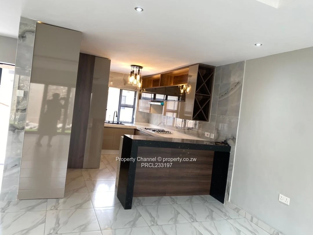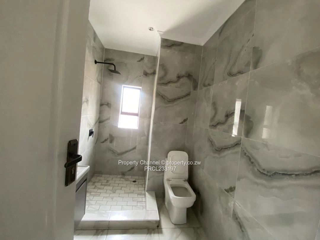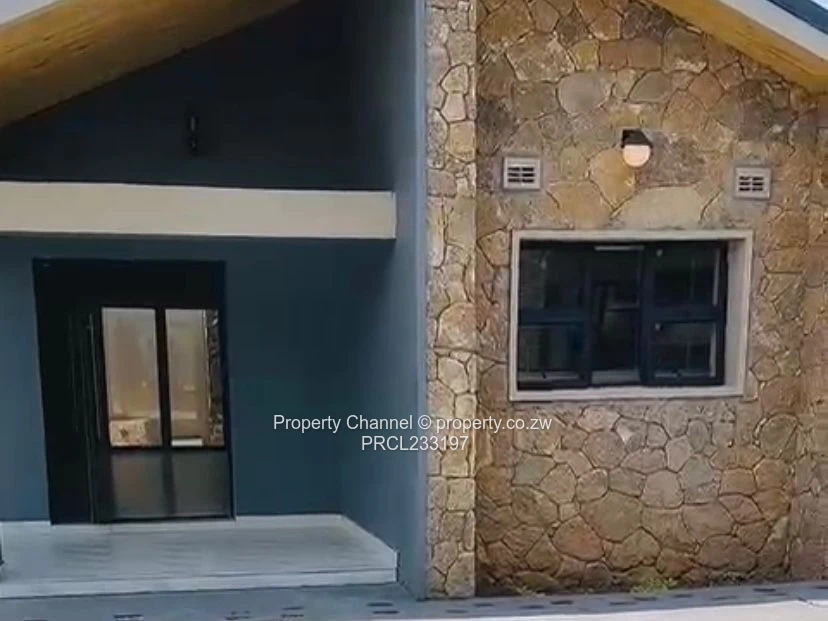 A choice of 5 modern 3-bedroom, main bedroom ensuite with a walk-in closet apartment for rent in Pomona, Harare North — stylish, brand-new finishings. As seen in the photos, the unit greets you with a stone-clad façade and covered porch, leading into a bright open-plan living area with elegant marble-look floor tiles and recessed LED ceiling cove lighting. The contemporary kitchen features sleek black cabinetry, built-in oven, gas hob, double sink and a breakfast bar with timber slat detailing — perfect for entertaining. The bedroom is light-filled with large black-frame windows; the bathroom is fully tiled with modern fittings. Outside you’ll find a private paved courtyard with artificial turf, washing trough and secure perimeter walls topped with electric fencing. The property also includes a borehole, free wifi and visible off the grid inverter/energy units for added reliability. High-quality finishes, secure setting and convenient Pomona location make this an ideal family home. Contact us to arrange a viewing.