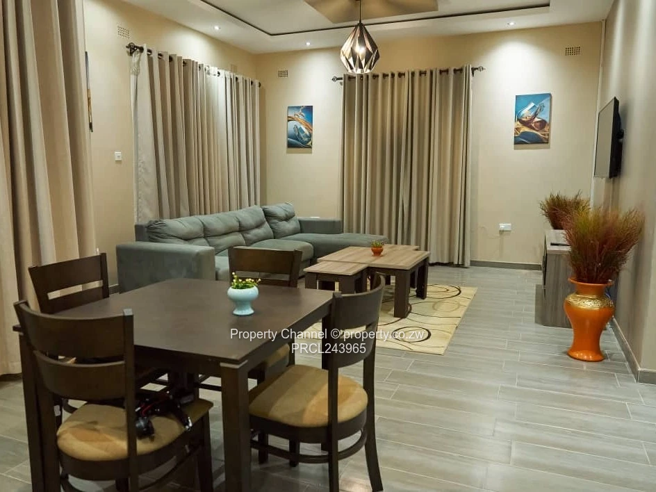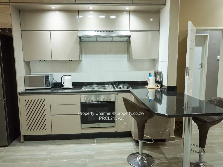 Charming fully furnished 3-bedroom, 2-bath home for rent in Arlington, Harare South — a neat 250 m² stand with 200 m² of comfortable living space. Immaculately presented exterior with paved driveway, low-maintenance garden beds and a roof-mounted solar water heater visible on the ridge. Inside, each bedroom is thoughtfully styled: plush headboards, bedside tables and crisp linens create a restful vibe, while the master features extensive built-in wardrobes and tiled floors for easy upkeep. The contemporary kitchen shown is fitted with sleek cabinetry, granite-look counters, an integrated oven and hob, extractor, microwave and a breakfast bar with stools — perfect for casual dining and entertaining. Two modern bathrooms, reliable communal borehole water supply and full furnishings make this a true move-in ready option for professionals or a small family seeking comfort and convenience in a quiet Arlington neighbourhood. Arrange a viewing today to experience the quality finishes and practical layout firsthand.