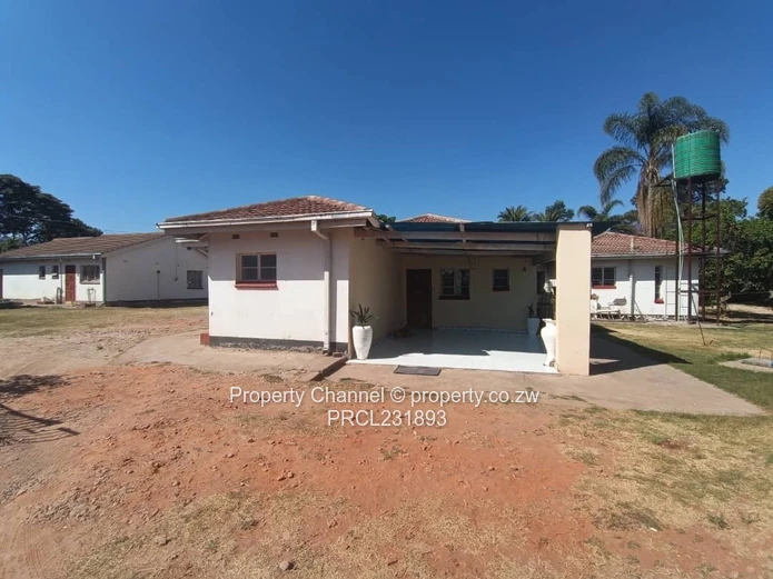 Exceptional opportunity in Greendale, Harare East — a spacious single-level home on a generous 5,502 m² stand with 400 m² of solid building. The house offers five bedrooms including a comfortable main en suite, large living areas and a covered verandah — ideal for family living or conversion into a multi-use property. The photos show a wide front façade with tiled roofs and expansive hardstand parking, mature jacaranda and palm trees giving established shade, plus an elevated water tank on a steel stand for reliable storage.