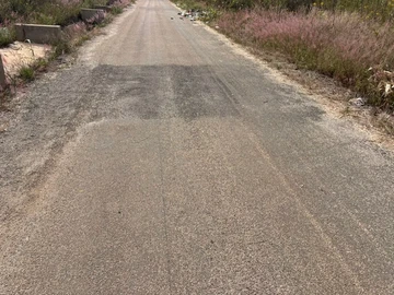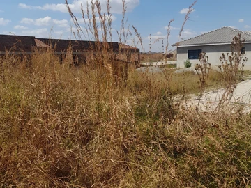 The nearby houses exhibit a combination of brick and plaster finishes coupled with pitched tiled roofs, reflecting durability and a touch of architectural finesse. While the environment is diverse with wild grass and some construction debris, it signals an evolving neighborhood with untapped opportunities for further development.